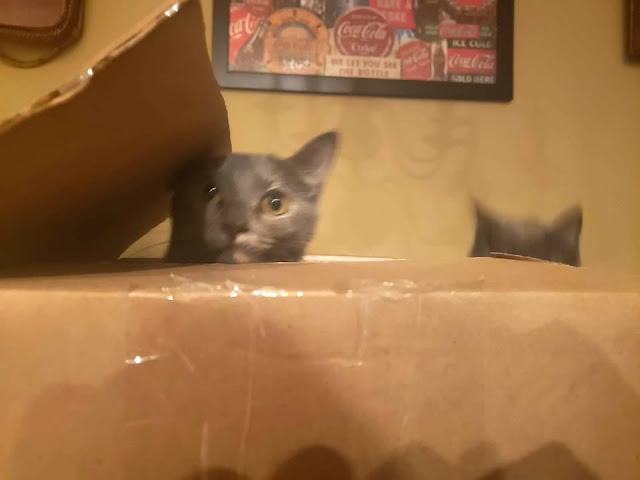 So, not the sharpest picture, but it shows the gist of the situation. I had just emptied a box and left it on the table. I was off doing something else and suddenly I heard a peculiar noise. It was a Bell-in-the-Box! From the looks of it, I don't think she expected to be caught. Lol. Notice Fiona's ears in the background. She's the innocent bystander (this time).